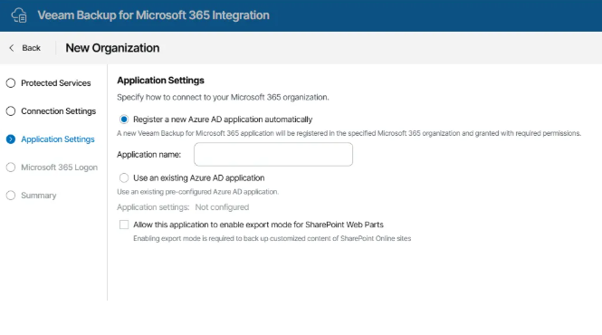 - Register a new Azure AD application automatically Enter a name for the application. The Veeam Backup for Microsoft 365 application will be registered in your Azure AD tenant and granted the required permissions.