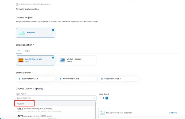 To create a custom Kubernetes plan in Antyxsoft Cloud simply follow next steps and spin-up your cluster in minutes.