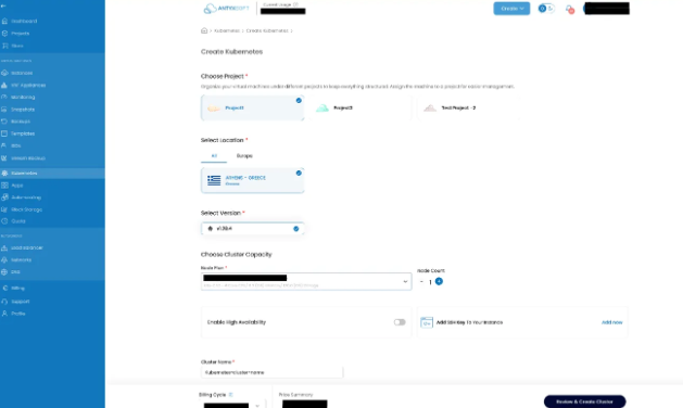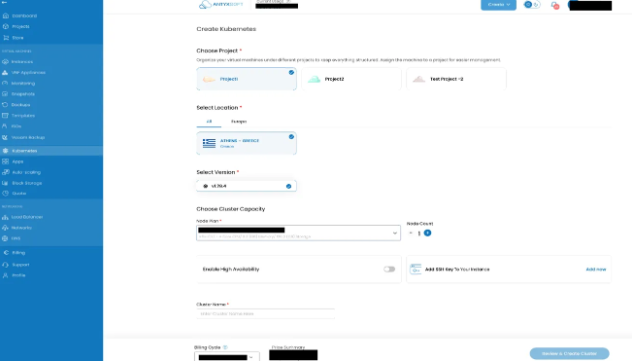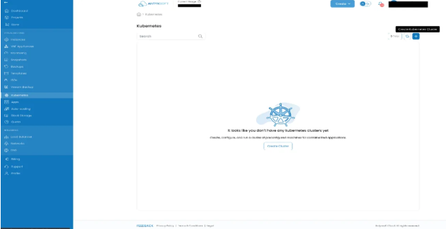 step 1 create a kubernetes cluster navigate to the kubernetes tab on the left side of the menu click on the create kubernetes cluster option step 2 configure cluster settings select the project , location , kubernetes version , and node plan from the available options increase the node count to set the number of worker nodes it's important to add your ssh key to the cluster; without an ssh key, you won't be able to access the cluster to add your ssh key, click on add ssh key step 3 add your ssh key add your public key with a name for the ssh key in the dialog box click on the add ssh key button step 4 review and create cluster once the ssh key is added, provide a name for your cluster click on review & create cluster step 5 finalize cluster creation a new dialog box will open with details of your kubernetes cluster, including billing information if all details are correct, click on the create cluster button step 6 cluster creation complete your kubernetes cluster will be created with the required controller node and worker nodes you can view the cluster details under the kubernetes menu how to access the kubernetes cluster ssh into control and worker nodes control node ssh i \<ssh private key> p 2222 cloud@\<public ip address of virtual router> worker node ssh i \<ssh private key > p 2223 cloud@\<public ip address of virtual router> note in case there are worker nodes more than one, then every worker node is mapped from port 2223 to the total number of worker modes for example if i have 3 worker nodes, then ports 2223, 2224 & 2225 are mapped to each worker node you can access all the worker node using the public ip of kubernetes cluster with their corresponding ports as shown in the commands above