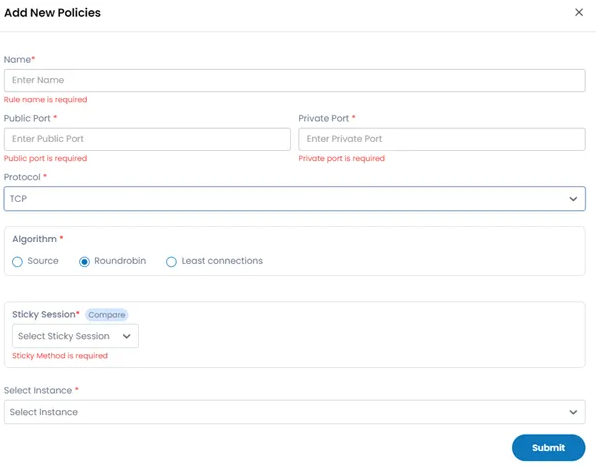 Select Instance: Choose the VM from your infrastructure to apply load balancing policy & hit Submit to deploy your instance.