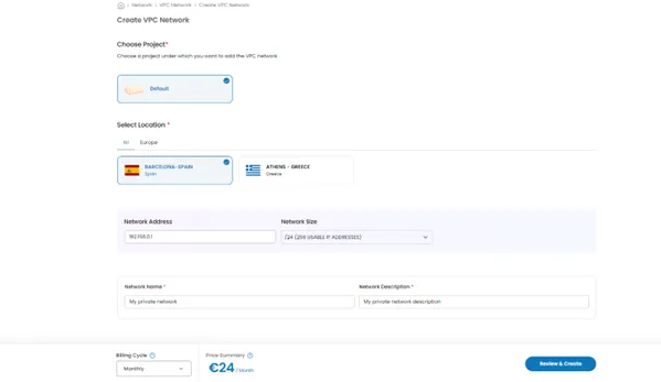 Select the Project and the Location where your firewall will be located. Select the Network Address (IP) the firewall will use and your network name. Select Billing Cycle, review your settings and hit Review & Create to deploy your instance.