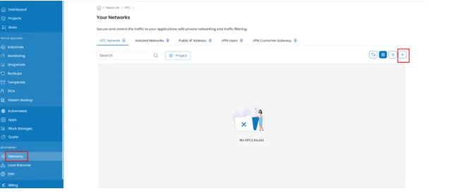 In order to create a cloud firewall simply navigate to Antyxsoft Cloud Portal and select Networks from the left menu. Next click on the + button to create your Virtual Private Cloud (VPC) firewall.
