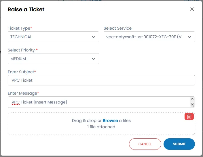 access the dashboard log in to your antyxsoft account once logged in, you'll be directed to the dashboard navigate to support from the left side navigation panel, locate and click on the support option (found towards the bottom) maximize the ticket window to view the form in full screen, click the maximize icon located in the top right corner of the form window a pop up form titled "raise a ticket" will appear ticket type choose the type of issue you are facing from the dropdown under ticket type select service from the select service dropdown, choose the relevant service for which you need assistance examples include virtual machines, routers, templates, veeam backup select priority choose the priority of your issue from the select priority dropdown options include low medium high none enter subject provide a concise subject describing your issue or request in the enter subject field enter message in the enter message section, provide a detailed description of your issue or request include any relevant information to help the support team resolve your issue attachments (optional) if necessary, you can attach files by dragging and dropping them into the designated area or by clicking browse to upload a file submit the ticket once you've completed the form, click the submit button to send your ticket to the support team track your ticket after submitting, you can track the status of your ticket in the my tickets section of the support page this will display both open and closed tickets continue the conversation click on your submitted ticket to open it you will be directed to the ticket page where a support expert will assist you from there, you can continue the conversation regarding your ticket we are committed to providing you with the best possible support experience by following the steps outlined above, you’ll be able to quickly and efficiently raise and track your support tickets our dedicated team is here to assist you every step of the way, ensuring your issues are resolved as smoothly as possible if you have any further questions, don’t hesitate to reach out we’re always here to help!