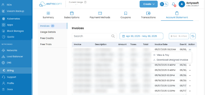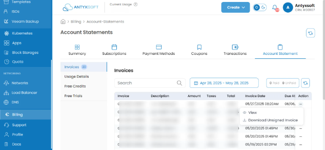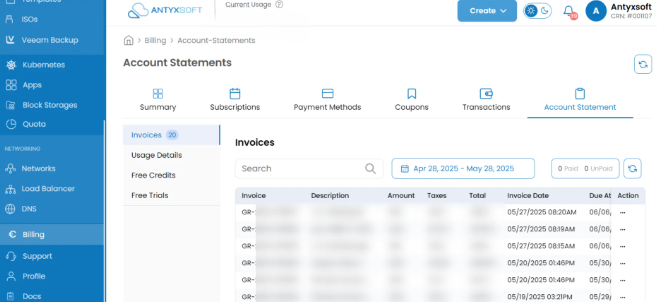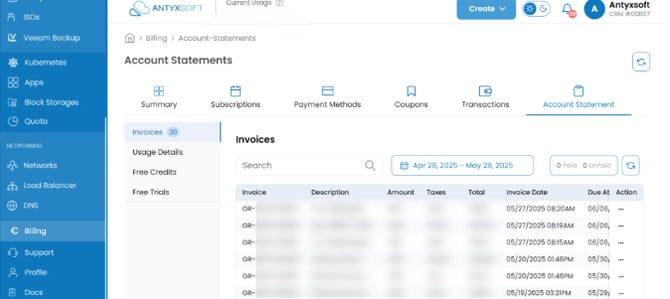 invoices are generated for your usage of cloud services and reflect the charges for your active resources, including any additional services in our cloud portal, you can easily view, download, and manage your invoices, ensuring you have complete visibility of your billing history view and download invoices navigate to the sidebar on the left side of your screen and select the billing option you will be redirected to the billing page click on the " account statement " tab and you will be redirected to the list of your invoices to view & download a specific invoice, click on the 3 dots in the column " actions " in the line of the invoice you would like to view or save then choose the option " view " for viewing it and " download unsigned invoice " for downloading it invoice details each line contains information about each invoice the description of the service that has been invoiced the subscription period (monthly, annually) the net amount of the invoices the tax amount (if you are tax eligible) the total amount of the invoice the due date the paid date the status of the invoice (paid or unpaid) how to pay unpaid invoices to pay an unpaid invoice navigate to the sidebar on the left side of your screen and select the billing option you will be redirected to the billing page six different tabs will appear click on the " account statement " tab select the unpaid invoice you want to pay click on the " view & pay " button, which will redirect you to the payment gateway to complete the transaction choose a payment method and click on " pay now " once payment is processed, the status of the invoice will be updated to paid terms and conditions billing responsibility you are responsible for reviewing and keeping track of your invoices ensure that payments are made promptly to avoid service interruptions or additional fees refund policy once an invoice has been successfully paid, the payment is considered final and non refundable this includes charges for services that were used, as well as any prepaid services we encourage our customers to review their usage and billing details regularly to avoid unexpected charges if you believe there has been an error in your invoice, please contact our support team within 7 days of the invoice date so we can investigate the issue faqs how do i change the email address for invoice notifications? after logging into your antyxsoft account, click on the profile icon in the upper right corner of the dashboard from the left hand menu, under profile , click on company details on the company details page, you will see the current company and billing information displayed τo update this information, click on the pencil icon (🖉) located to the right side of the page once you click the pencil icon, the company fields will become editable you can update the following information organization name, billing address, website, phone number, state/country/city, vat number, billing contact name, billing email address after making the necessary changes, you will have two options save click the save button to confirm and apply the changes you made cancel if you decide not to save the changes, click cancel to discard any updates and return to the previous state what do i do if i think there’s an error on my invoice? if you believe there is an error on your invoice, please contact customer support with the details of your concern we’ll review the issue and work with you to resolve it what happens if i don’t pay my invoice on time? if an invoice remains unpaid past the due date, your account will be freezed after 40 days, suspended after 60 days and terminated after 90 days it’s important to pay your invoice on time to avoid service interruptions can i view invoices for previous billing periods? yes, you can view and download invoices for all past billing periods simply go to the invoices section in the portal, and you’ll see a complete history of all invoices, even those from previous months or years