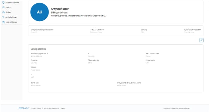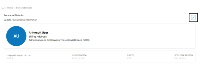 in the personal details menu, you have complete control over viewing and updating your personal information and billing details this feature makes it easy to keep your account information current and ensures a seamless billing experience editing your personal details to update your personal details follow these steps once you login at the https //portal antyxsoft io click your profile picture located at the top right side of the screen click profile and you will be directed at the personal details page to edit click the pencil button located at the top right of each section once you make your changes click save to confirm