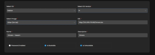 To upload the ISO, you need to declare the appropriate settings. Below are the settings used in the current example: