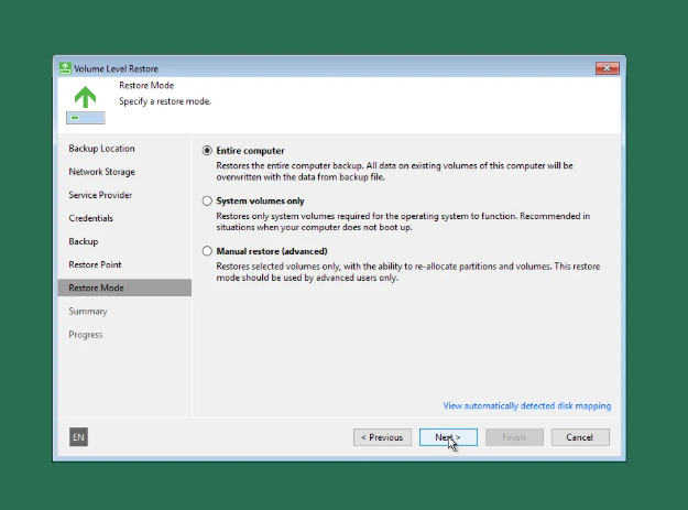 Proceed with the restore mode Entire Computer to restore the whole system.